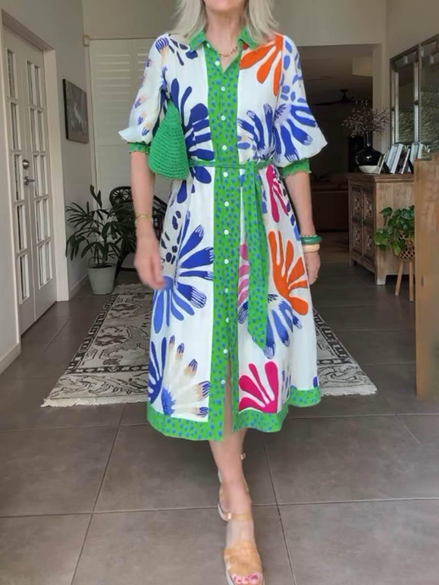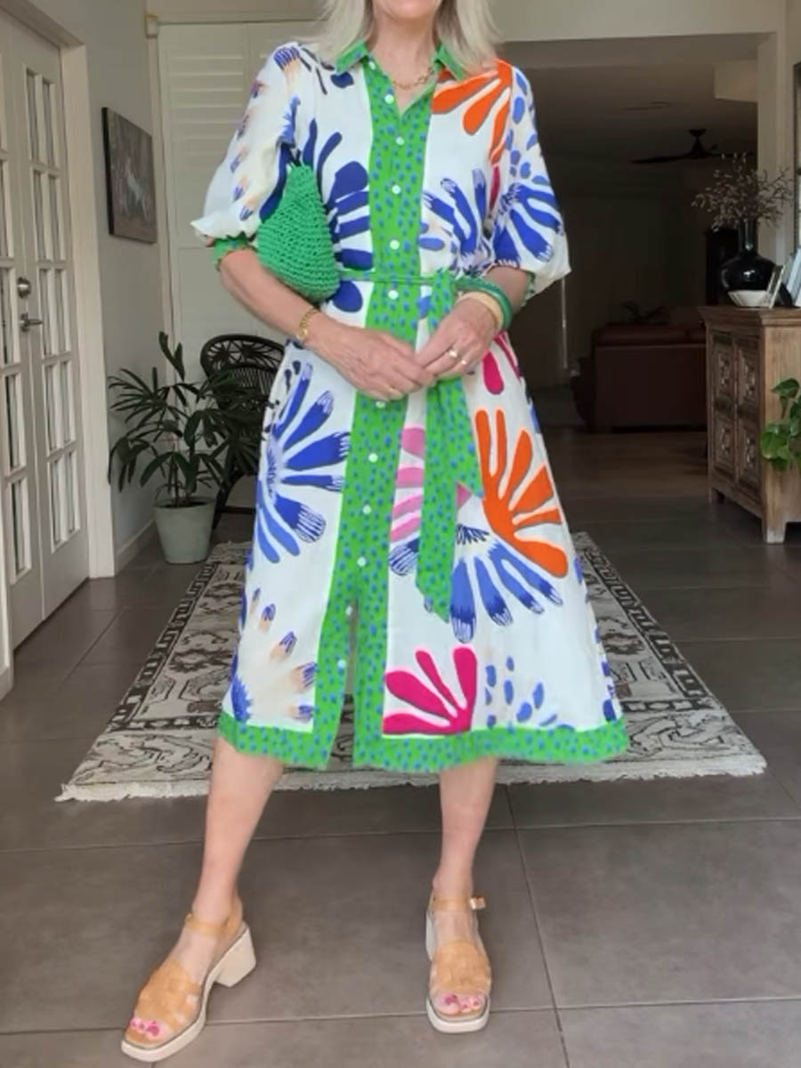 Printed V Neck Sleeve Cuffs Loose Dress