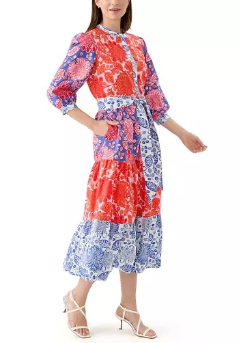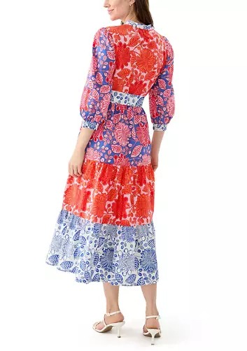 Covered in a bold mix of colors and prints, this tiered midi dress is complete with pretty blouson sleeves.