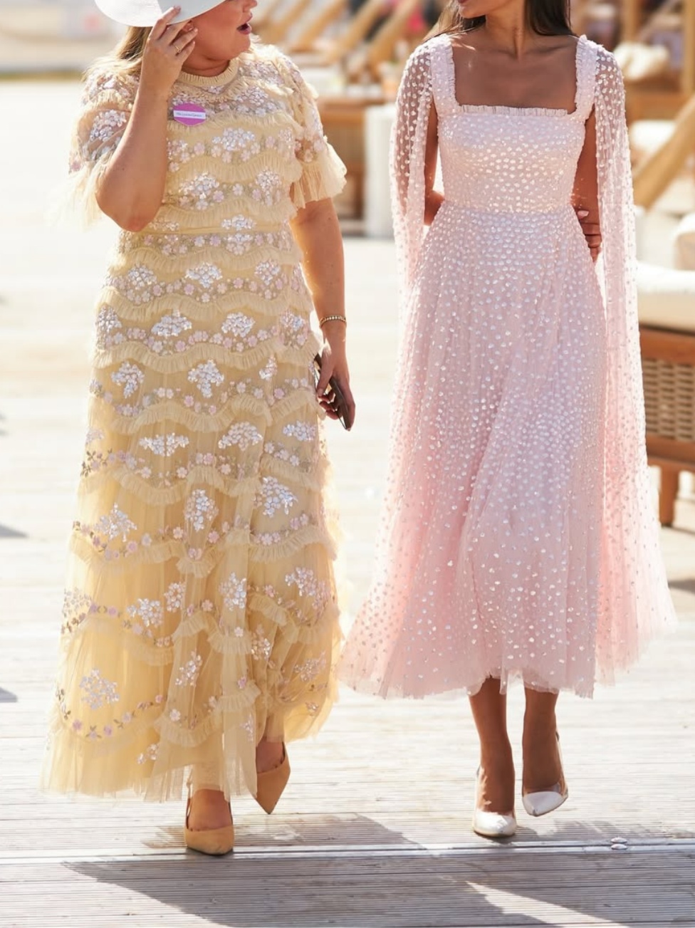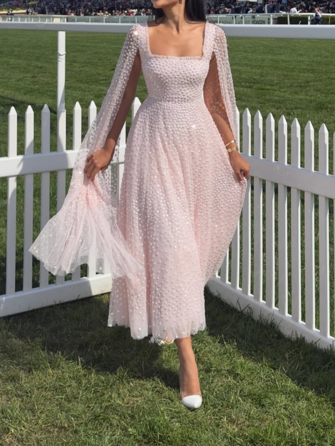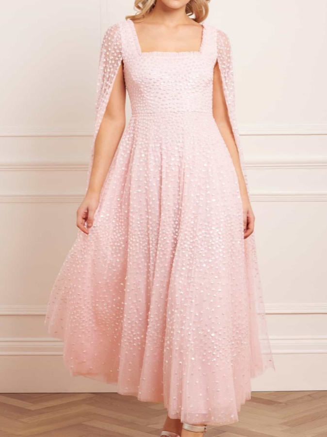 This embellished gown is decorated with exquisite shimmering dot motifs, undulating in wave formations for a captivating glittering effect. Designed with a sweeping floor-length cape for romantic detailing and a statement look. The flattering square neckline is trimmed with signature tulle frills. The skirt is made up of generous layers of net and tulle with a sweeping hemline. The perfect choice for an upcoming special occasion and beyond.