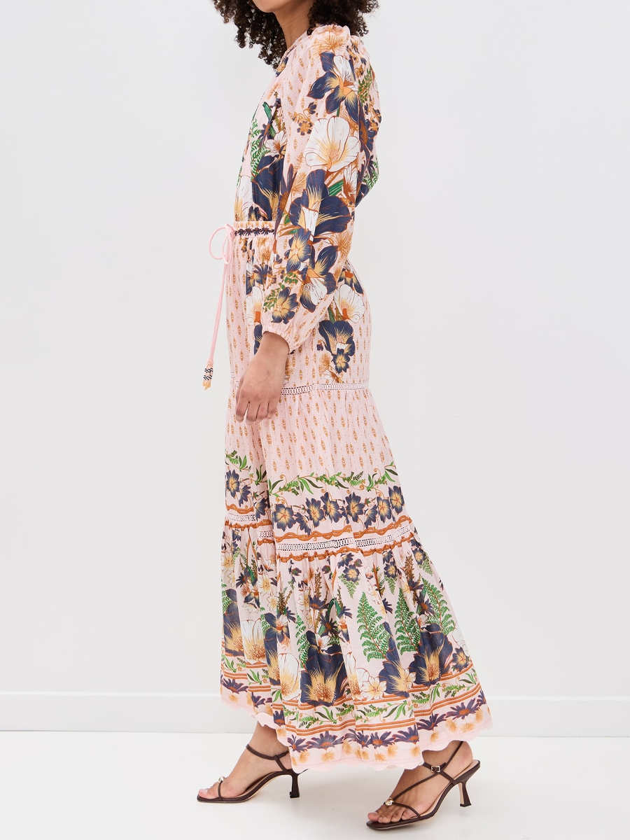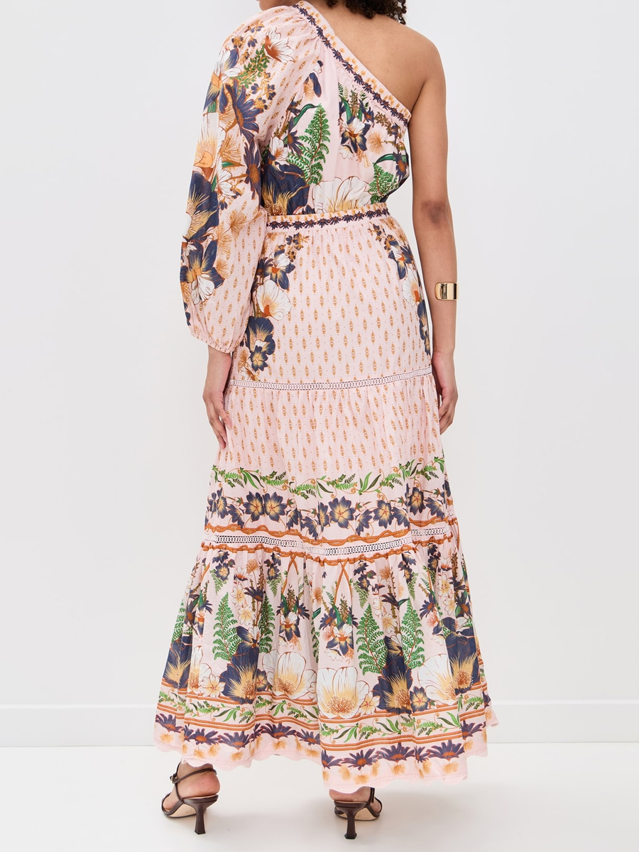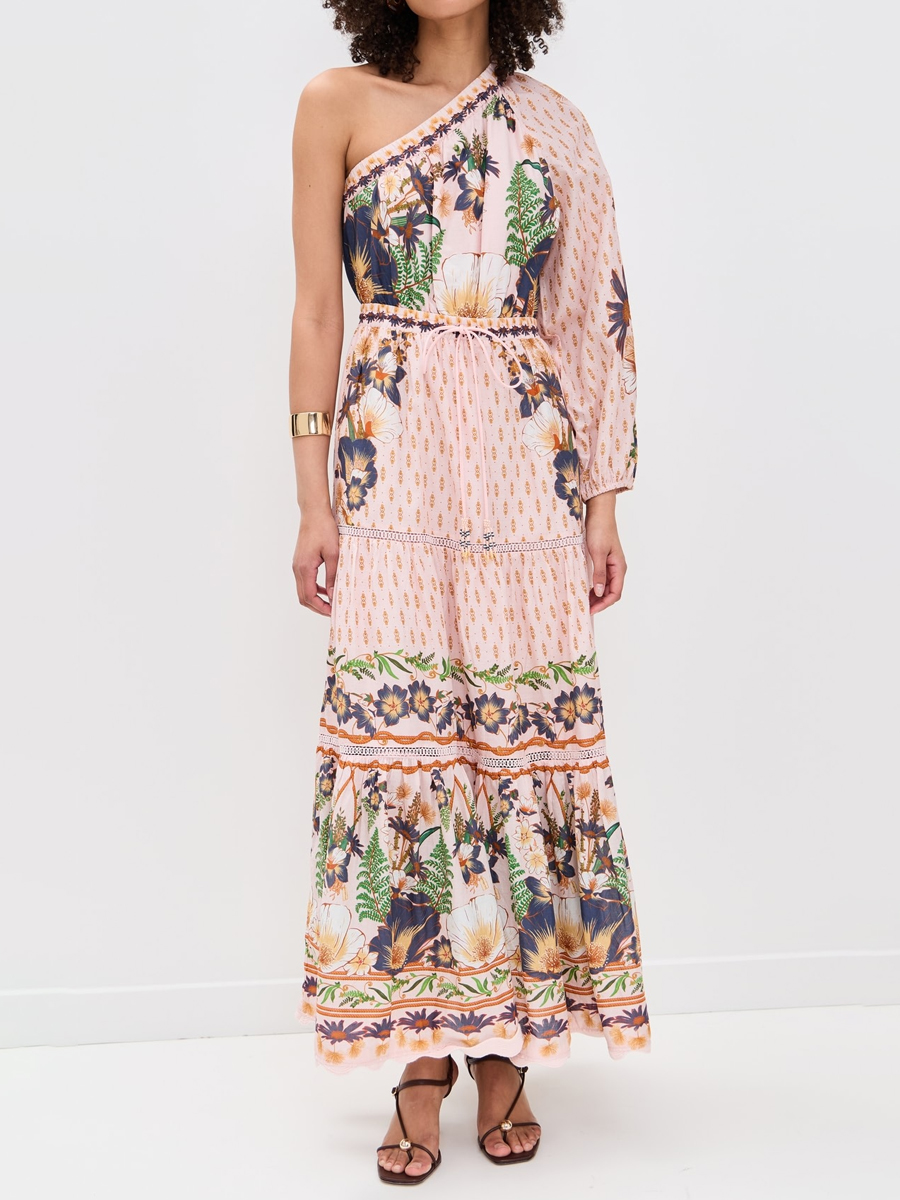 One-shoulder Drawstring Waist Printed Maxi Dress