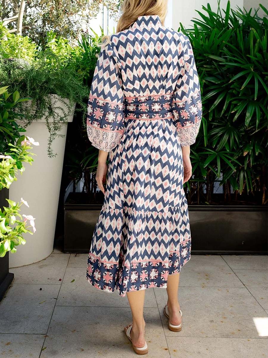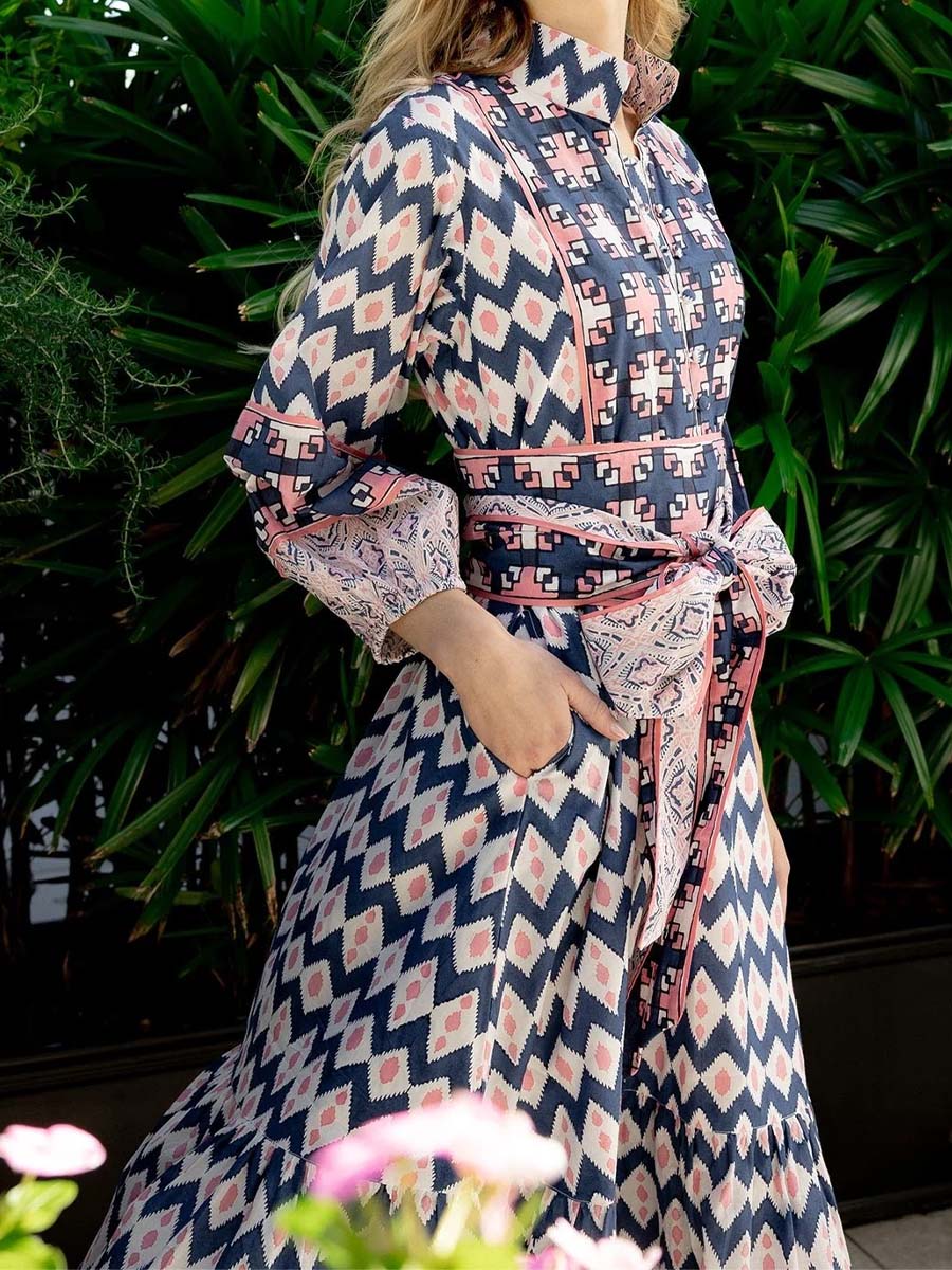 What is prettier than whimsical bubble pink paired back to the rich navy blue? It makes for the most perfect timeless dresses for vacation and into spring! It is comfortable and has all of our signature thoughtful details: button placket front, face-framing banded collar, pockets, custom contrast borders, tiered skirt, and hand-piping.